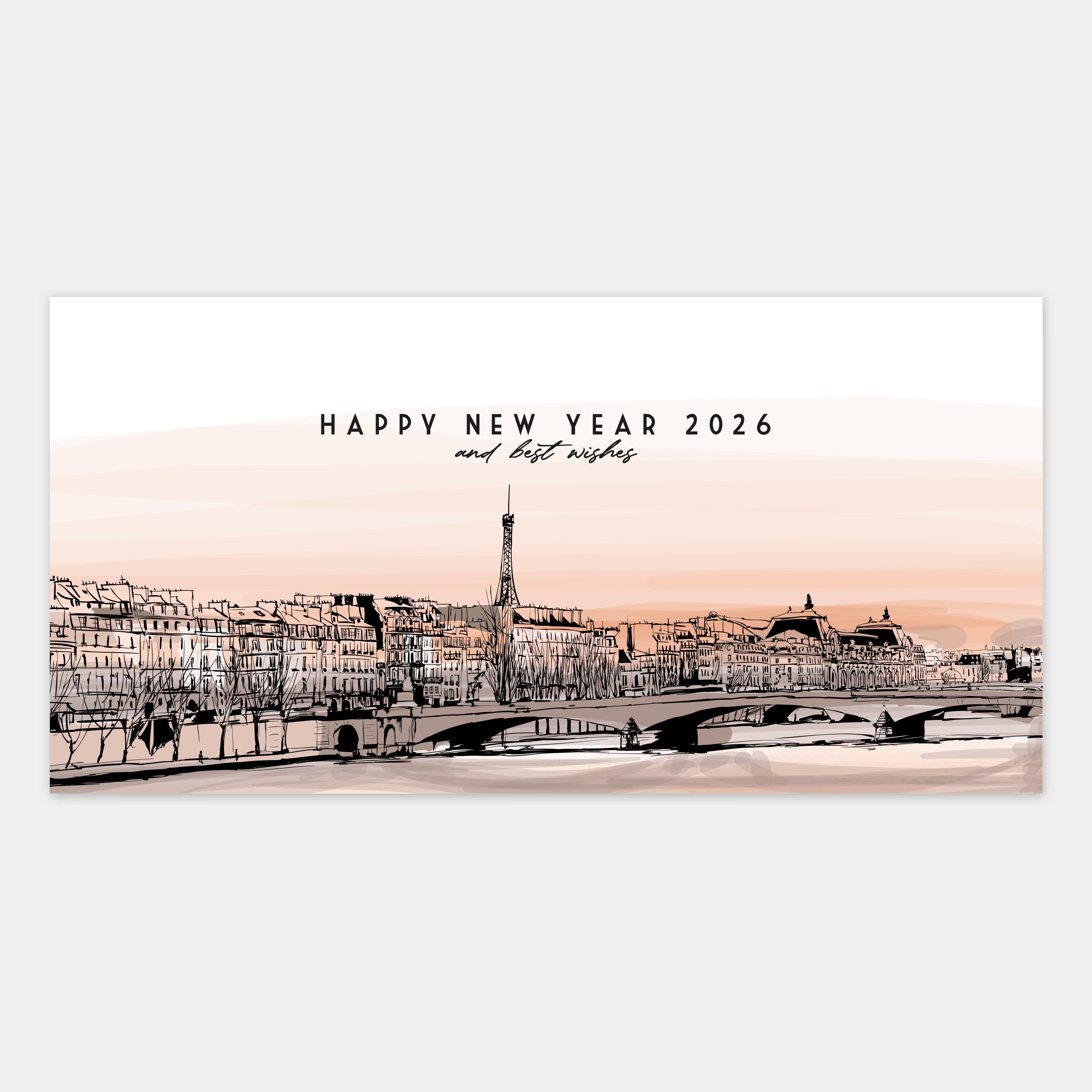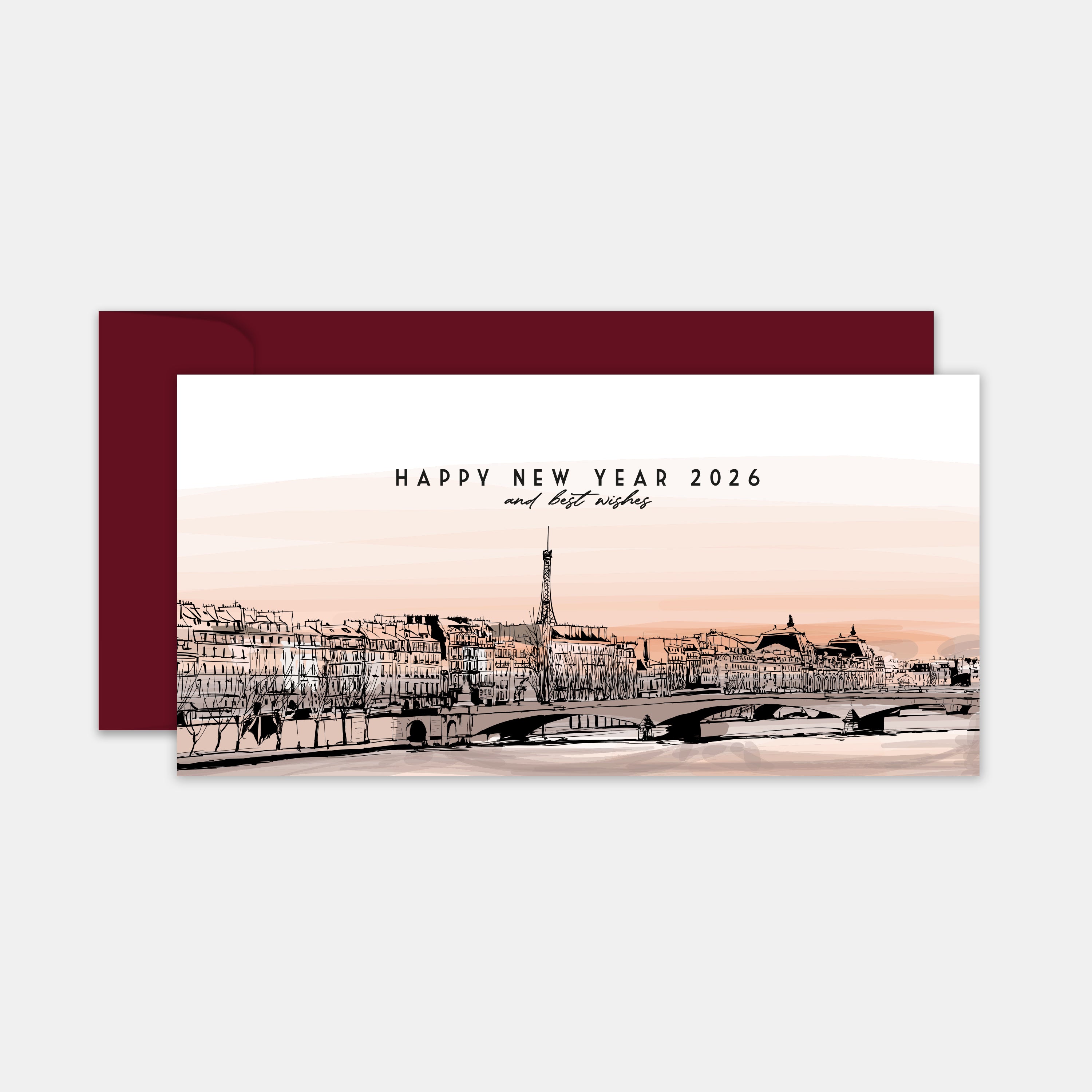 Notre carte de voeux Paris sunset est un joli mélange d’une belle illustration représentant un coucher de soleil sur la ville Paris dessinée à l'aquarelle et d'une mise en page douce et moderne composée d'une jolie typographie manuscrite.