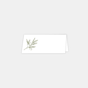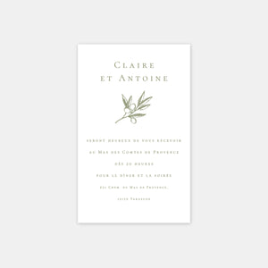 Notre carton de remerciement branche d'olivier est un joli mélange d'un logo type champêtre forme de rameau d'olivier dessiné à la main, d'une mise en page douce et moderne composée de deux belles typographies.