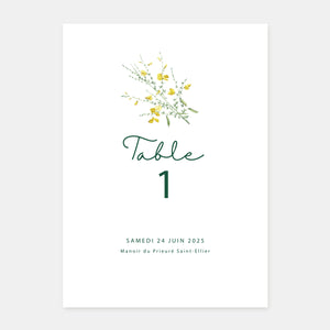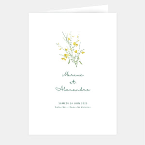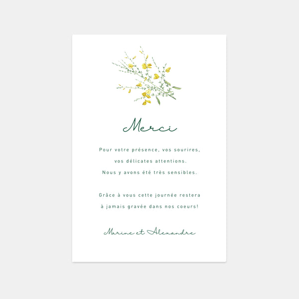 Notre carton de remerciement de mariage brin de fleurs sauvages est un joli mélange d'un dessin représentant un brin d'ajonc, une jolie fleur champêtre sauvage jaune, et d'une mise en page douce et moderne composée avec deux belles typographies.