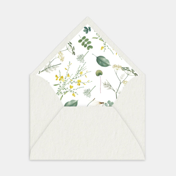 Ajoutez une touche d'élégance à votre correspondance avec notre doublure d'enveloppe fleurs sauvages. Fabriquée à Paris dans notre atelier avec du papier vélin 100g/m² certifiée FSC, cette doublure met en valeur l'illustration que vous avez choisi pour votre faire-part de mariage.