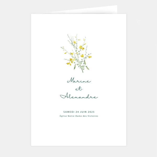 Notre livret de mariage brin de fleurs sauvages est un joli mélange d'un dessin représentant un brin d'ajonc, une jolie fleur champêtre sauvage jaune, et d'une mise en page douce et moderne composée avec deux belles typographies.