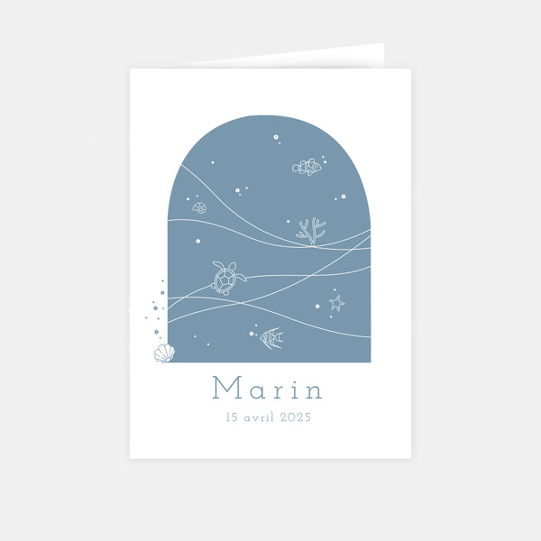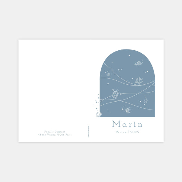 Notre faire-part de naissance une fenêtre sur l'océan est un joli mélange d’une illustration représentant une fenêtre avec vu sur la mer dessinée à la main, d'une photo de votre enfant et d'une mise moderne composée d'une jolie typographie et de plusieurs petits pictogrammes modifiables.