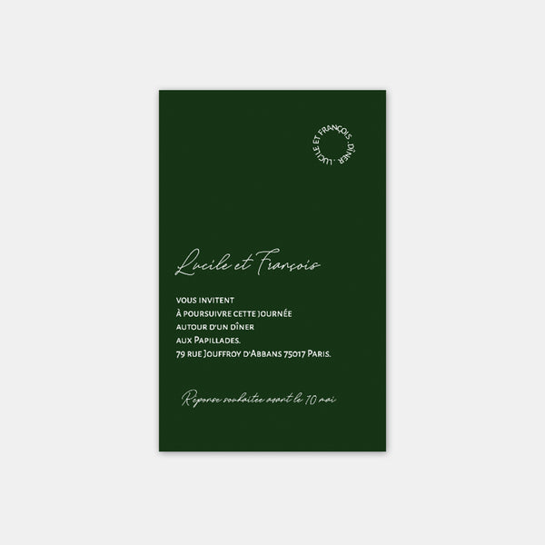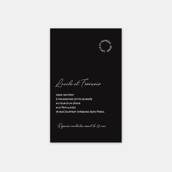 Mit der Auswahl dieser Einladungskarte „Modern Circle“ aus unserer Hochzeitskollektion entscheiden Sie sich für eine moderne und schlichte Karte, mit der Sie Ihre Freunde und Familie zu Ihrem Hochzeitsempfang einladen können. Alle unsere Hochzeitseinladungskarten werden in unserer Pariser Werkstatt auf den schönsten Papieren unserer Sammlung gedruckt.