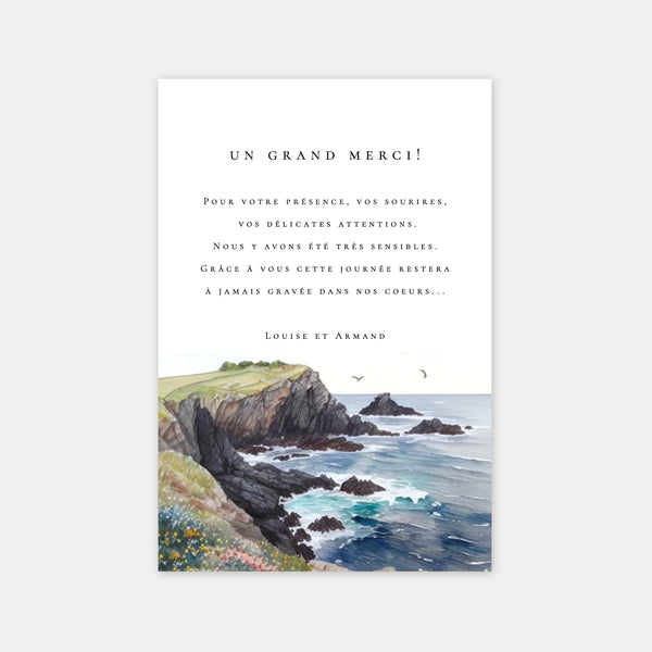 Unsere Dankeskarte zur Hochzeit Das Aquarell „Bretonische Küste“ ist eine schöne Mischung aus einem Aquarell, das eine handgezeichnete Landschaft der bretonischen Küste darstellt, und einem weichen, modernen Layout.