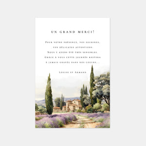 Notre faire-part de mariage triptyque Provence aquarelle est un joli mélange d'une aquarelle représentant un paysage typique d'un domaine provençale dessinée à la main et d'une mise en page douce et moderne composée avec de belles typographie. Ce faire-part est proposé en format triptyque 180x260 mm. Tous les faire-part de mariage de notre collection Mariage sont imprimés dans notre atelier parisien sur le plus beaux papiers de création certifiés FSC® de notre collection