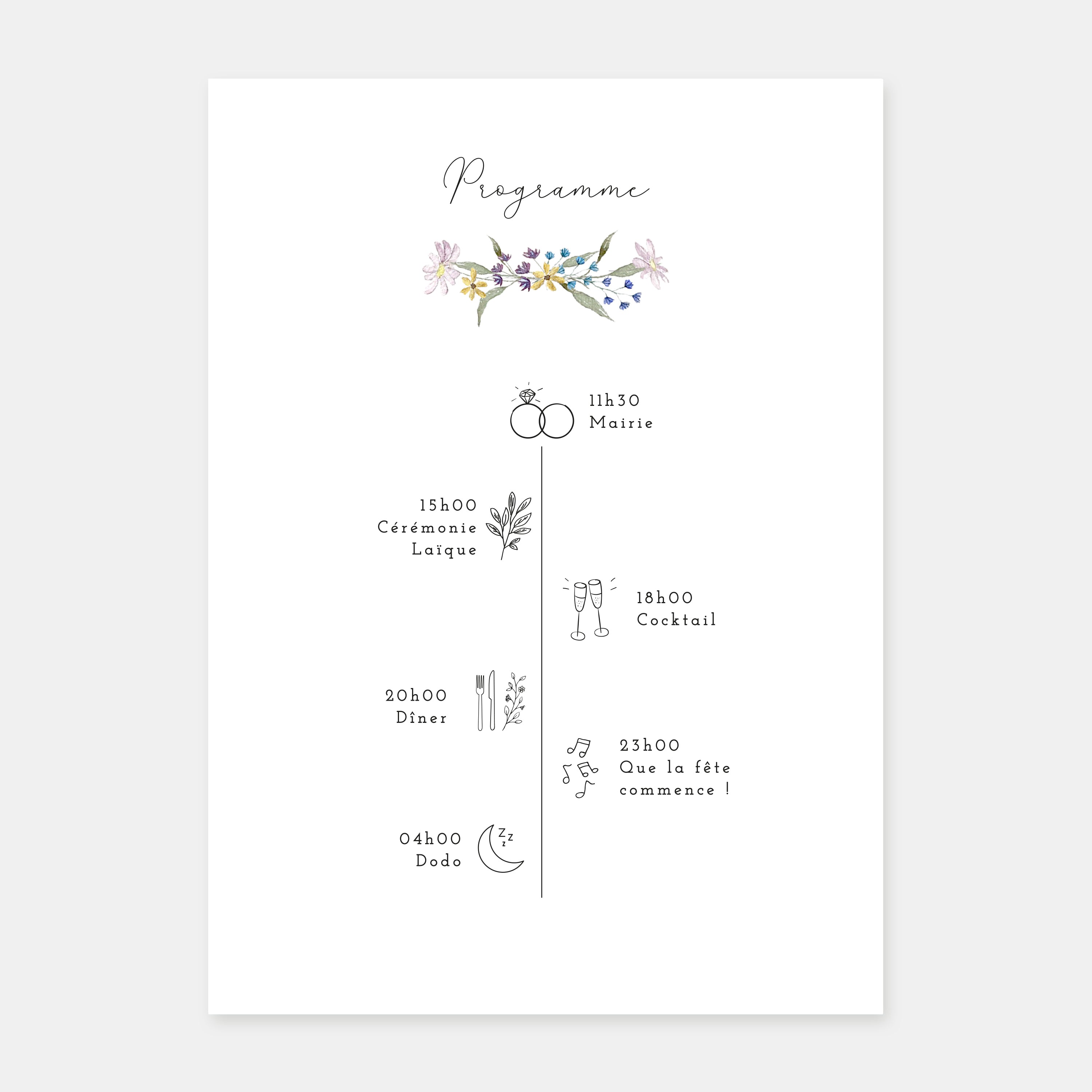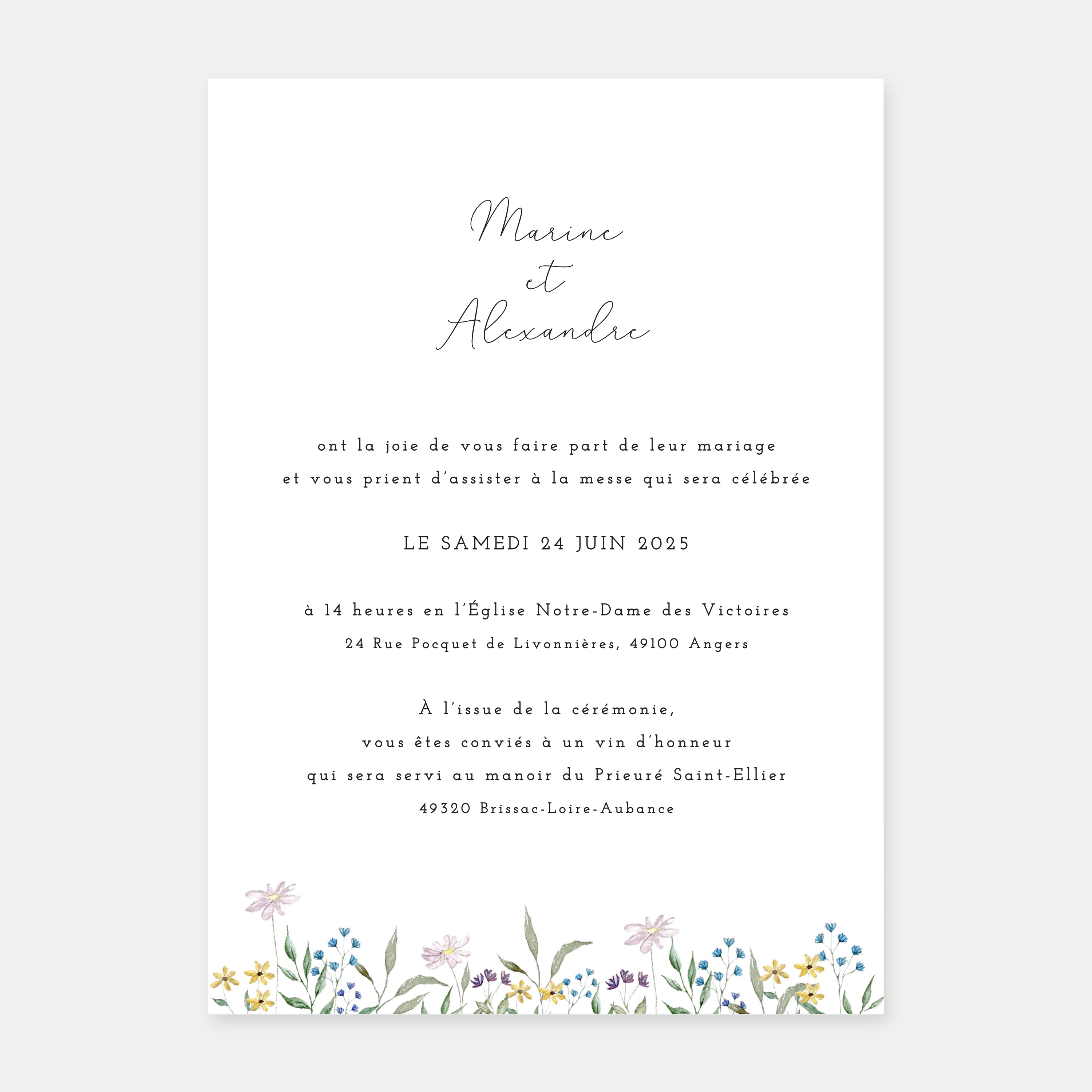 Unsere Hochzeitseinladung mit ländlichem Kranz ist eine hübsche Mischung aus einer Zeichnung eines Blumenarrangements, bestehend aus mehreren pastellfarbenen Wildblumen in Aquarell, und einem weichen und modernen Layout.