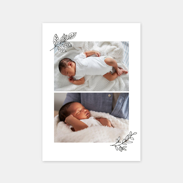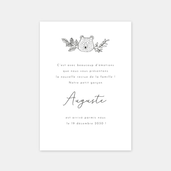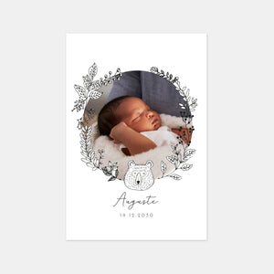 Our mouk birth announcement is an elegant mix of a photo of your child, a beautiful illustration representing a plant crown composed of flowers and foliage accompanied by a hand-drawn bear's head and a soft and refined layout composed of two beautiful typographies.