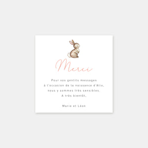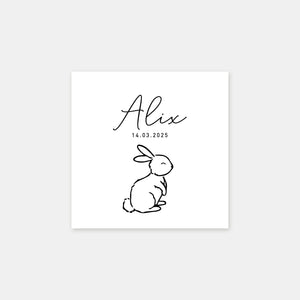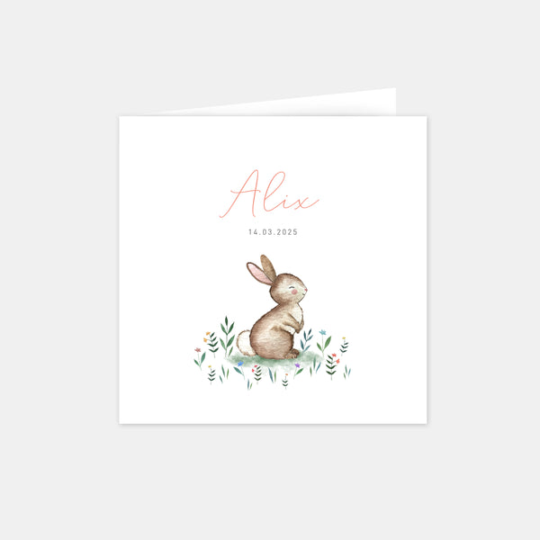 Our little rabbit birth announcement is a lovely mix of a beautiful hand-drawn illustration and a soft, modern layout composed of one or more handwritten or more conventional typographies.