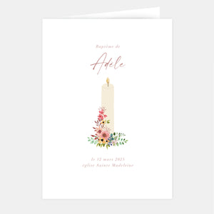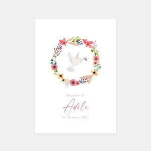 Our flowered dove baptism bookmark is a pretty mix of an illustration representing a dove accompanied by hand-drawn seasonal flowers and a modern layout composed of two beautiful typographies on simple card in 65x195 mm bookmark format.