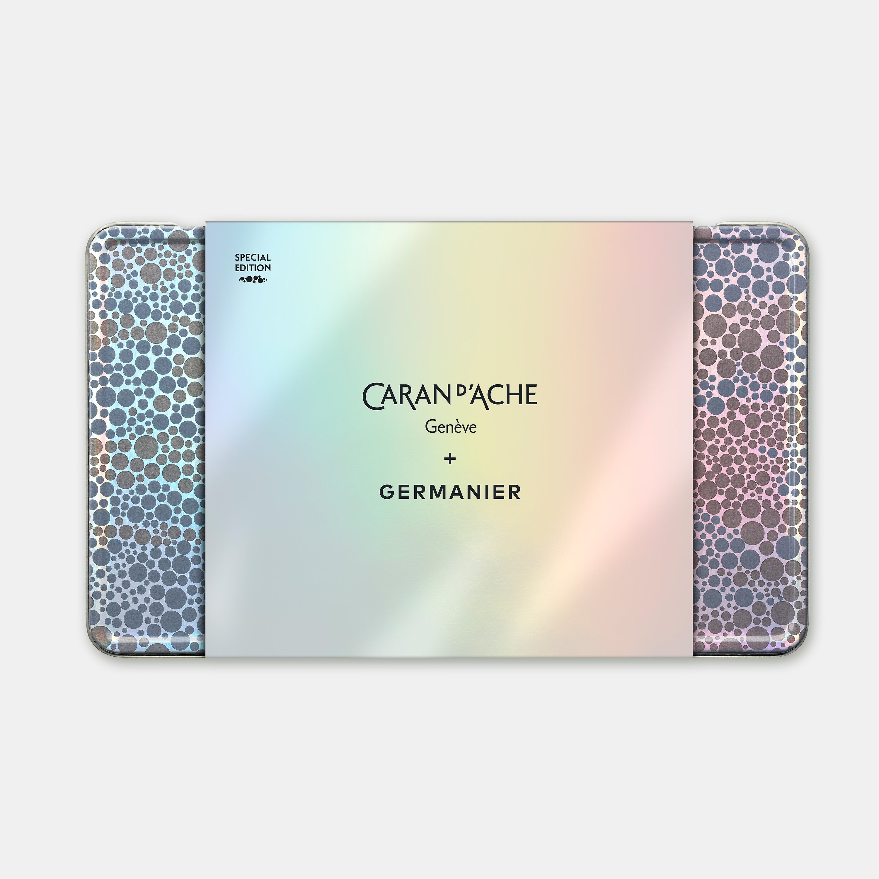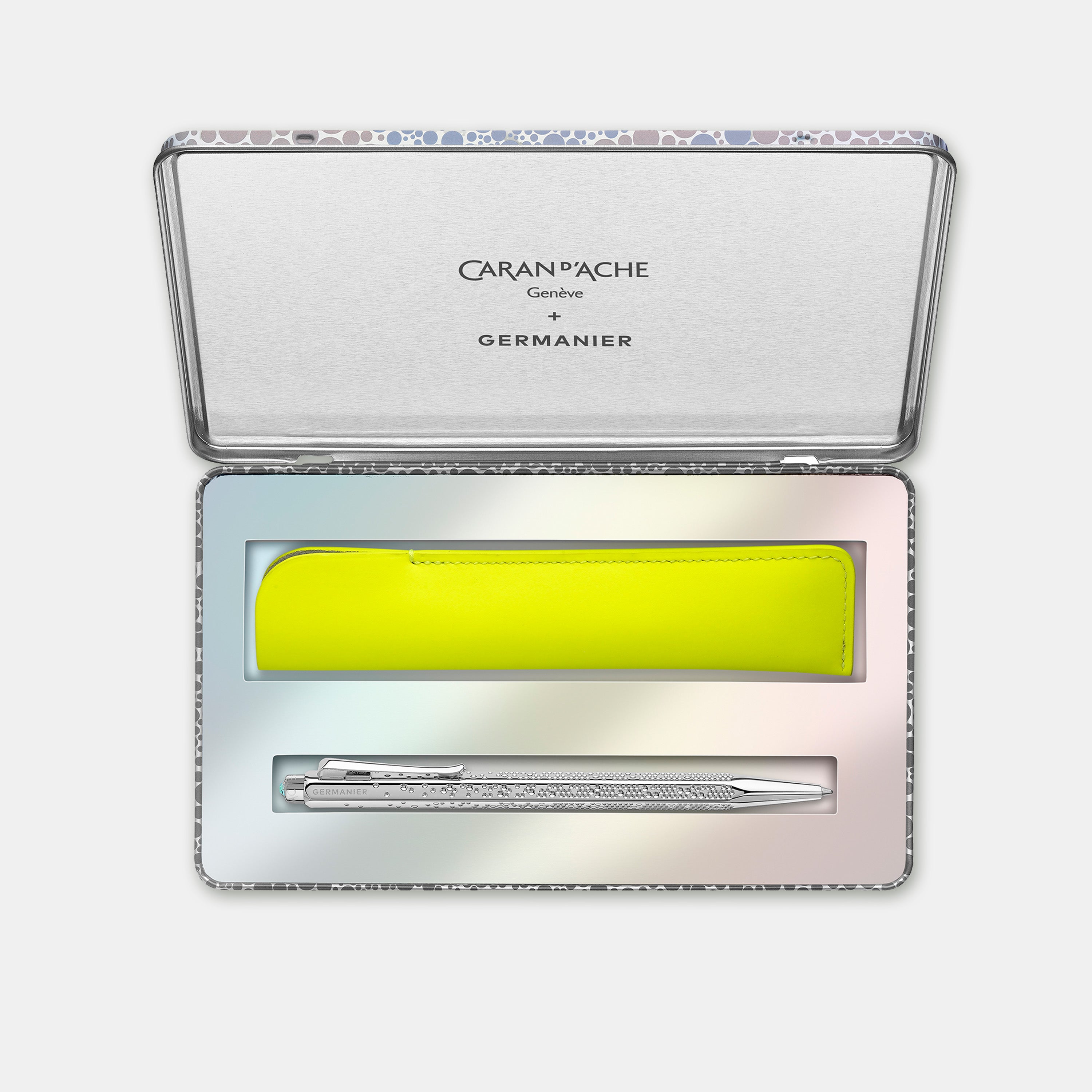 ’Édition Spéciale Les Fulgureuses capture l’énergie intrépide de Germanier à travers des instruments uniques d’Écriture. Le stylo Ecridor™, au guillochage inspiré du tissage de perles, est orné d’un cristal holographique et accompagné d’une pochette en cuir upcyclé jaune fluo. De la silhouette hexagonale, au style authentique et à la fiabilité inégalée, ces instruments sont le fruit de l’immuable volonté d’allier l’art du guillochage à la précision Suisse.