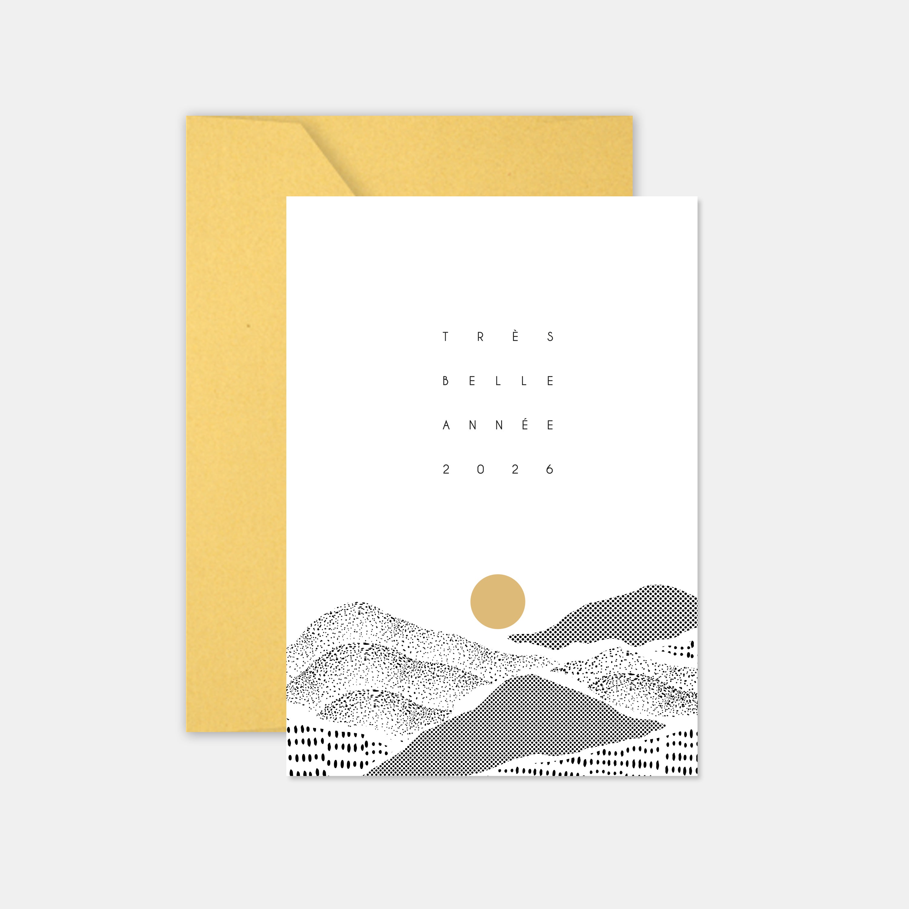 Cette carte de voeux a été imaginée par notre équipe créative. Vous pouvez personnaliser l'intérieur de cette carte en y ajoutant votre image ou photo, le logo de votre entreprise, un texte ou bien le laisser vide pour écrire votre message à la main. Toutes les cartes de voeux de notre collection sont imprimées dans notre atelier parisien sur le plus beaux papiers de création de notre collection tous certifiés FSC®.