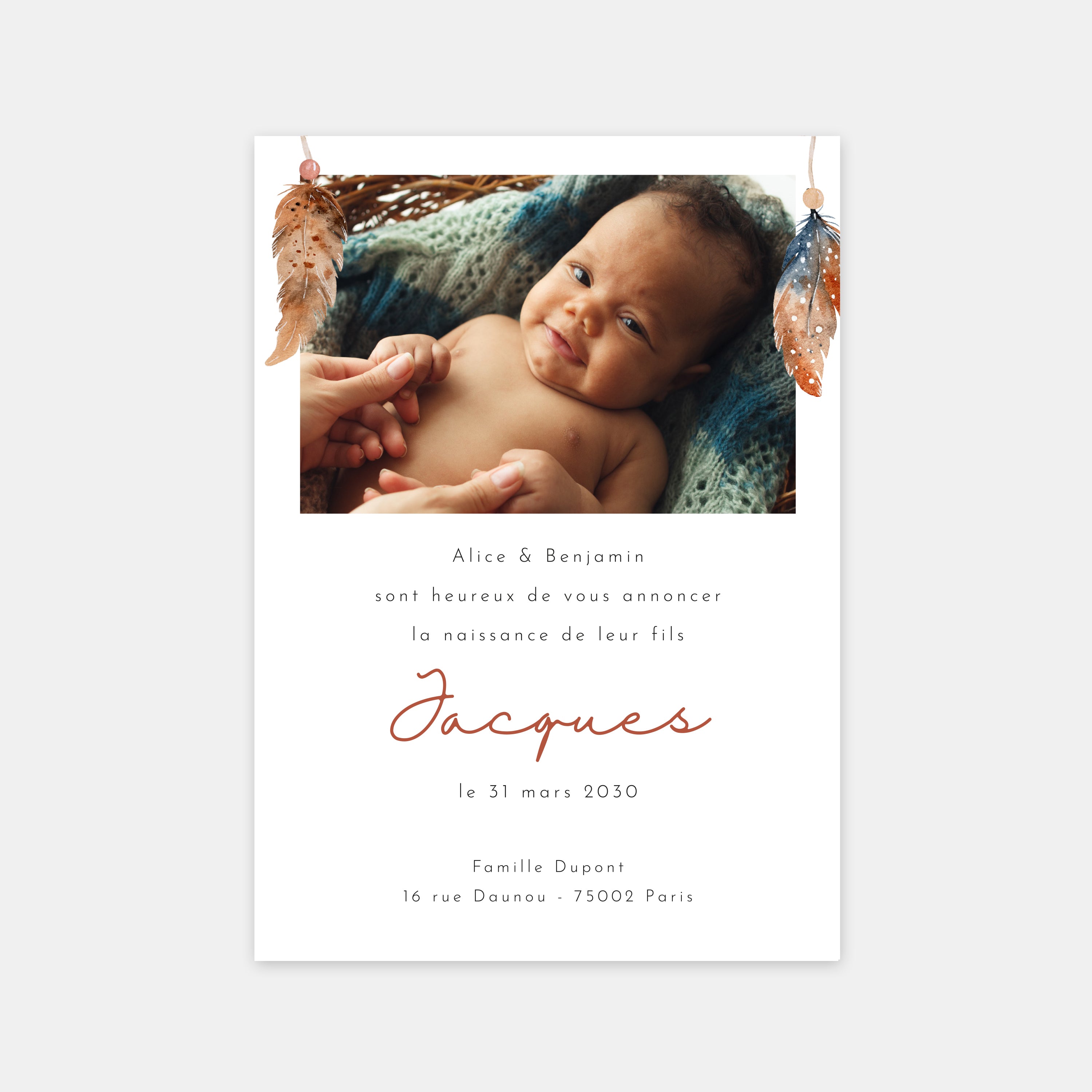 Annoncez l’arrivée de votre petit trésor avec notre faire-part de naissance Dreamcatcher, inspiré de l’univers bohème chic. Son design délicat, orné d’un attrape-rêves, symbolise douceur et protection pour votre nouveau-né. Idéal pour partager cette merveilleuse nouvelle avec élégance et originalité. Tous les faire-part de notre collection naissance sont imprimés dans notre atelier parisien sur le plus beaux papiers de création certifiés FSC® de notre collection.