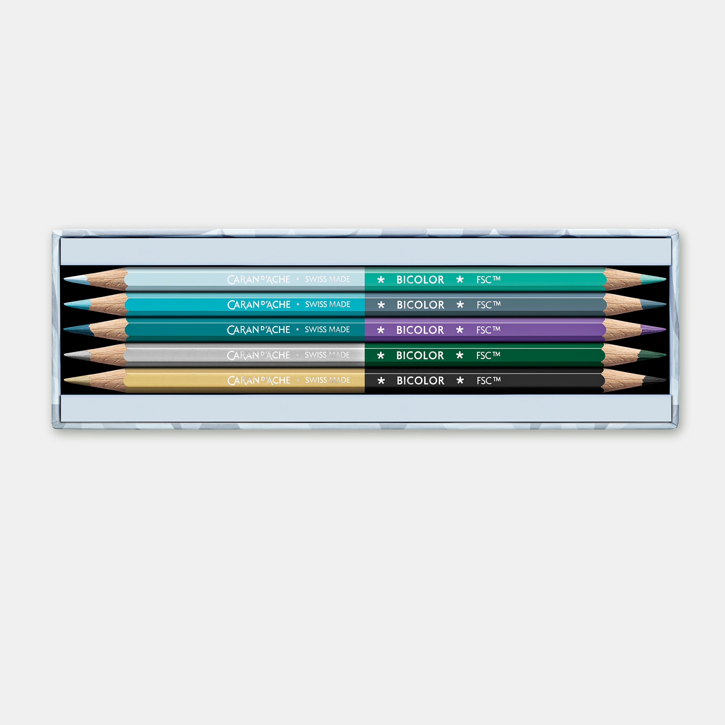 Set de 9 crayons bicolor de couleurs aquarellables mine tendre et résistante de Ø 3 mm + 1 pinceau n°5 soit, soit 18 couleurs BICOLOR exclusives aux accents glacés. Avec l’Edition Spéciale Alpine Frost, Caran d’Ache vous invite à un voyage à travers les montagnes enneigées . Inspirée par la pureté des lacs gelés et la silhouette des sommets blancs, cette collection aux teintes blanc nacré et bleu polaire, capture toute la magie de l’hiver. Set de crayon de couleur collector développé en Suisse.